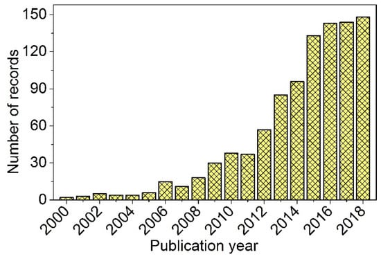 These natural colorants have been of interest in different fields and applications []. Particularly interesting is the use of natural dyes as sensitizers in dye-sensitized solar cells (DSSCs) [,,], their main advantages being a simple extraction procedure, low cost, wide availability, and their environmentally friendly nature [,,]. For almost three decades, DSSCs have been considered a focus line of renewable energies, as a promising simple alternative power source. The increase in the number of publications reflects the interest on the subject []. The cell efficiency has been steadily improving due to extensive efforts in numerous experimental investigations and theoretical or computational studies, but there are many areas that deserve further research [] before considering these cells as a feasible commercial product []. The DSSC device is an ensemble of various materials that undergo different interactions and processes, and researchers have focused on the study, modification or innovation of each component. For example, the dye or sensitizer, responsible for solar energy caption, should possess certain features in order to effectively play its role for an efficient performance. The research community has attempted to find the best sensitizer and has developed different types of them: Ru-complex dyes, metal-free organic dyes, quantum dot sensitizers, perovskite-based sensitizers, and natural dyes [,,]. Dye molecules are adsorbed onto a nano-structured layer of a wide band gap semiconductor (i.e., TiO2) to harvest photons. If these solar cells are to be considered a as a green energy generator, the more “natural” the dye, the more “green” the device. For NDSSCs (DSSCs using natural dyes), the number of publications, scarce in the decade of 2000, has increased since 2009 (Figure 1). As an example of the still alive controversy, the early work by Zhou [] studied 20 natural dyes and Narayan [], only a few months later, published a review pointing out the requirements of photosensitizers, why the NDSSC efficiency is low and further recommendations. Something similar occurs nowadays; reviews have been published stating recent progress in natural dyes [,] but there are still challenges in the mass production of NDSSCs [,]. So this subject is still of interest to researches, i.e., conferences and symposiums are being held, and since last year, almost 200 papers related to “natural dyes and DSSC” have been published, both from the experimental and theoretical points of view, aimed to improve devices and understanding of the different materials and phenomena involved. In general, and some examples are cited next, most papers include firstly experimental details about dyes. Pigments are obtained from a great variety of plants, some animals or minerals by different methods, and then are characterized through UV–Vis and FTIR spectrophotometry [,,]. Further purification, combinations, analysis, and use constitute the body of the studies, together with new ideas about cell implementation. Researches have focused on the influence of different factors on the final performance, such as: solvent for extraction and adsorption [,,], extraction time [], pH and temperature during dye adsorption onto the nanoporous film [], dipping time [], dye mixing or co-sensitization [,,], together with “tandem” cells [], film thickness [,] etc. Some papers include also theoretical calculations or simulations [,,], for example, adsorption isotherms of a dye onto TiO2 film are fitted by models established through statistical physics treatment [] or chlorophyll is used as a reference dye to simulate absorption spectra and theoretically calculate ground and excited state properties []. There have also been some interesting ideas related to the improvement of cell efficiency. Due to its nature or different chemical structure, chlorophyll dyes performed different in different liquid electrolytes [] and this could be related to iodide mobilities []. Exposing the photo anode 10 min to microwave frequency enhances electrode characteristics and efficiency and absorption of dye []. Studying the recombination processes for different natural dyes, the most efficient dyes can be discriminated []. To obtain dyes, a strategy to induce anthocyanins synthesis in in-vitro cultures, has been presented: Stress induced by nutrient deficiencies leads to the production of secondary metabolites such as anthocyanins []. Also, to improve the efficiency and anchoring ability of natural dye, two algal buffer layers (sodium alginate and spirulina) are introduced previously to dye (anthocyanin) sensitization []. Firstly, the TiO2 film is treated with a layer of sodium alginate to help in producing more hydroxyl groups on the surface, improving the dye concentration in the film. Secondly, an algal layer made of Spirulina is sensitized above the film (with alginate) for uniquely enhancing the anthocyanin efficiency in DSSC.