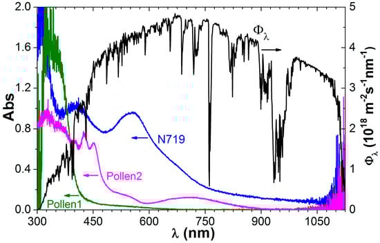 Something similar happened to pollen. Figure 2 shows spectra of pollen extracts with Solutions 1 and 2. This figure also includes spectral photon density, Φλ, calculated from the standard ASTM G173-03 reference solar spectrum derived from SMARTS v. 2.9.2 and provided by Plataforma Solar de Almería (PSA-CIEMAT, Almería, Spain). These data provide information to analyze dyes’ spectra. Since TiO2 absorbs at wavelengths below 387.5 nm (semiconductor bad gap Eg = 3.2 eV), there is an optical window of interest for dyes in the visible region, from 400 to 750 nm, where the higher the wavelength the higher the number of photons despite them having less energy. Roughly speaking, a dye is presumed to work better when having wide absorption near red wavelengths.