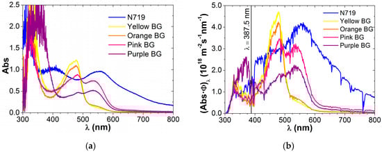 The spectrum of N719, the most widely-used artificial dye for DSSCs, is also included in Figure 2 as a reference. As can be seen, N719 has a peak around 400 nm and a wide peak around 550 nm, both of which are in this spectral region. The wavelengths may change slightly, as they depend on dye concentration and pH [].