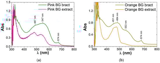 Figure 4a,b show the comparison for pink and orange BG respectively. From both a and b graphs, it can be concluded that: (i) The shape of both bract and extract spectra are similar, although the peaks corresponding to the main betalains pigments are of course more evident in the extract than in the solid sample. (ii) Besides, the spectra peaks in the dye solution appear in general at lower wavelengths (see Table 2). Chromophores containing electrons with low activation energies (responsible of absorption peaks) change with media, pH, or even with temperature, and consequently the amount of energy absorbed by those functional groups also changes, moving the position of the main peaks, in this case, to higher energies. iii) Finally, a remarkable fact is that the chlorophyll peak (around 670 nm, []) of the bract diminishes or even disappears in dye solution, probably because chlorophyll molecules present in bracts are eliminated when the dye is extracted following our process with acetone solvent solutions, as it is known that ethanol has been preferably used when the pigment of interest is chlorophyll [,].