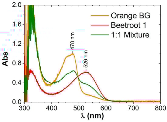 UV-Vis spectrum of dye mixture (green line) 1:1 orange bougainvillea extract with beetroot extract, both with Solution 1. Spectra of individual dyes are also included.