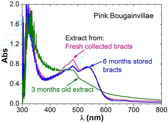 UV-Vis spectra of pink bougainvillea extract 3 months after preparation (green line). UV-Vis spectra of recently prepared dye extracts made from (i) bracts just after been collected (red data) and (ii) bracts preserved for 6 months (blue data).