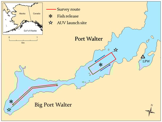 Map of Port Walter and Big Port Walter, Alaska, showing the survey routes used during autonomous underwater vehicle (AUV) missions and the sites where acoustically tagged juvenile Chinook salmon were released. AUV operations were based at the Little Port Walter (LPW) research station.