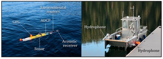Remus 100 autonomous underwater vehicle (left panel) used during field trials in marine waters of southeastern Alaska during 2016. The vehicle was equipped with payload control hardware and software (internal), a receiver and hydrophone for detecting and recording acoustic transmitters, an acoustic Doppler current profiler (ADCP), environmental sensors, a side-scan sonar, and a GPS receiver for collecting positioning data. A boat equipped with an acoustic receiver and dual hydrophones was used to conduct concurrent surveys (right panel). The hydrophone struts were lowered into the water and vertically oriented during tracking, with the hydrophones submerged to a depth of 1 m.