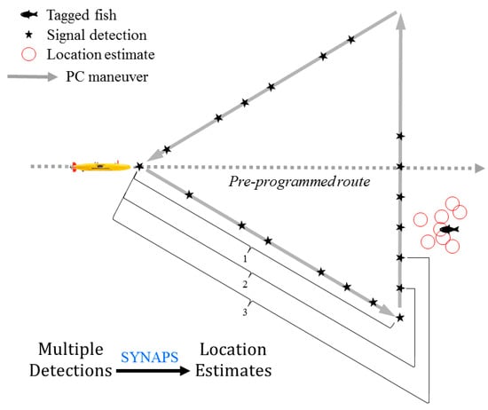 Payload control (PC) maneuver, consisting of a base-forward triangle, used by an autonomous underwater vehicle to estimate the location of acoustically tagged fish. SYNAPS software was used to calculate a series of location estimates using multiple signal detections, starting with the first 8 detections (Estimate 1) and increasing incrementally (Estimate 2 based on 9 detections, Estimate 3 based on 10 detections, etc.).