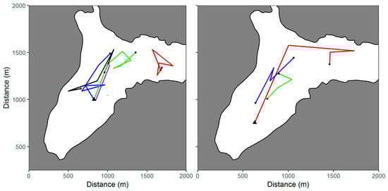 Movements of juvenile Chinook salmon tagged with acoustic transmitters and located using an autonomous underwater vehicle in Big Port Walter, Alaska. The movements of five fish detected during Mission 24 are shown in the left panel. The right panel shows the movements of Fish 12003 over three successive missions. The site where the fish were initially released (black triangle) and the last location of the fish (black dot) are indicated.