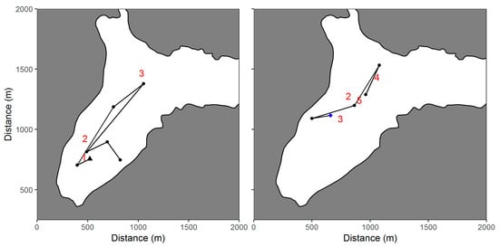 Comparison of the movement of Fish 12010 (left panel) and Fish 12004 (right panel) located using an autonomous underwater vehicle and vessel-based tracking in Big Port Walter, Alaska. The site where the fish were either released (black triangle) or first located for the fish released during a previous mission (blue diamond) are indicated. Subsequent AUV locations are represented by black dots. Vessel-based location estimates are designated by numbers that correspond to the sequential order of the paired AUV estimates (e.g., the numbers 2 and 4 correspond to the second and fourth AUV location).