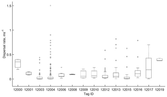 Box–whisker plot of the dispersal rate distribution of acoustically tagged juvenile Chinook salmon in marine waters of Port Walter and Big Port Walter, Alaska, representing the median value (central mark), 25th and 75th percentiles (lower and upper box edges), most extreme data points (whiskers), and outliers (+).
