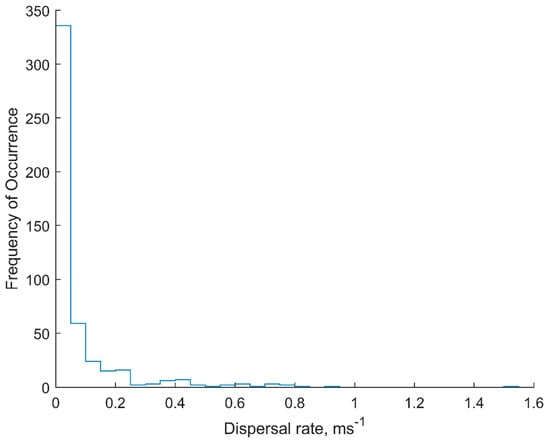 Most (14, 82%) of the fish released in Big Port Walter left the area within 24 h, with the three remaining fish leaving within 48 h. Residency information is not available for the two fish released in Port Walter during the last mission (M26). Estimated dispersal rates were calculated for 14 fish that met the established criteria (Figure 6), yielding a total of 485 pairwise combinations for rate estimate ϒ. The rates ranged from 0.0002 to 1.5040 ms−1, with a sample mean and standard deviation of 0.0757 ± 0.1531 ms−1. However, these rates exhibited a half-normal distribution with the mode equal to the minimum (essentially 0) and 93% of ϒ < 0.25 ms−1 (Figure 7). The mode in ϒ was not necessarily related to the mode in elapsed time, but could be depending on the particular span of observations since the fish moved independently of one another, often interspersed linear movements with milling behavior (e.g., Fish 12003, M21), or returned to a location near their initial position after a series of ostensibly stochastic movements (e.g., Fish 12004, M25) (Appendix C). The sample mean was therefore heavily biased towards fish that milled, or that made linear excursions and then returned to the initial location, because more data points were collected for these individuals and greatly weighted the average. The grand mean and standard deviation with individual fish as the sample unit was 0.1419 ± 0.1065 ms−1. Expressed as body length per second for comparative purposes, this was 0.62 BLs−1, with a maximum rate of 6.54 BLs−1.