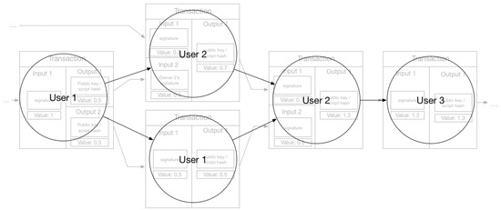 The research focused on linking information in the blockchain demonstrated that it is possible to use heuristics and link pseudonyms to a single user. There is growing literature on how to create user profiles [4,5,15,16]. To create profiles, we need to link related transactions and link related keys. A simple way of linking transactions is to use the fact that they are naturally related through the output-input structure, creating a DAG as shown in Figure 1 and in the background of Figure 2. This graph depicts the relationship between the transactions (nodes). However, this network will only show how transactions are related and not much about the users themselves, due to the use of pseudonymous keys. This problem is illustrated in Figure 2 where we have overlaid the keys and the flow between them. We have in total seven keys in this transaction sub-graph, and with one key being used twice, the unique number of keys is six. Without linking keys, the number of possible users will be the same as unique keys, as we cannot easily determine if two keys belong to the same user or do they represent different users. Linking keys, or grouping them into clusters, create a set of keys controlled (potentially) by the same user or entity, which means we have reduced the set of possible participants in the transaction graph. If we could link all keys related to a user, we would be able to find all activity that the user participated in. Using the set of keys related to each user, we can create a user network similar to the transaction network, but where the nodes is users in addition to transactions, and the edges is the output-input pair from the transactions—i.e., showing the flow of Bitcoin from one user to another as illustrated by Figure 3. This user network is shown in Figure 3 allows us to discover how funds are moved between users. This is the ultimate goal of de-anonymization techniques. Reid and Harrigan [4] created such networks in their paper analyzing Bitcoin privacy. In a paper reviewing Bitcoin privacy papers, Herrera-Joancomartí [6] states that this user network allowed Reid and Harrigan do user-centered analysis, giving context to the data in the blockchain. Reid and Harrigan also created an ancillary network when linking keys (nodes being a unique key and edges being a relationship between two keys). This network would contain the key sets fund for each user, each set represented by a maximally connected component in the network. A different type of user network was created by Meiklejohn et al. [5]: not structured as the transaction graph as the one in Figure 3, but instead showing users outside the context of the transaction graph. Each node is a user (linked key set) and the edges were any transaction between the two, showing us if a pair of users had done any transactions at any point in time. These networks illustrate the main goal of linking information: user profiles. A set of linked keys representing a user allow us to see the activity of that user.