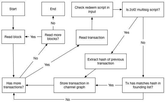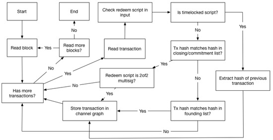 Our software parses the blockchain and identifies relevant transactions, using both the multisig and timelocked identification methods. We use the btcd [19] Bitcoin implementation which is written in Golang, to synchronize and store the blockchain data. Our software, which is also written in Go, uses libraries from btcd to read this data from disk and make it available to us as a convenient data structure. At a high level our software finds the latest block from the blockchain stored on disk and uses it as a starting point; it then iterates over the transactions in the block, and checks if they are relevant, i.e., they are part of a channel graph. If that is the case the transactions are stored in a data structure representing a channel graph. After all transactions in a block are parsed, the hash of the preceding block is used to fetch it from the disk, and the same process is repeated. For each transaction parsed, the input part is checked for the presence of a 2of2 redeem script, if that is the case, a channel graph is created, and the transaction is stored as a closing transaction. As explained in Section 2.3 each transaction has an id, which is the transaction hash. Transaction inputs reference the hash of the transaction containing the output they spend, so when finding a potential closing transaction, we get the hash of the corresponding funding transaction. This is stored in a list, which we can use to recognize funding transactions when we encounter them in the blockchain. We can always check the hash of each transaction we parse, to see if it is the funding transaction for a closing transaction we have already found. If there is a match, we have found all transactions for a single channel graph. This is the main algorithm for the software as can be seen in Figure 5, where the process described above is illustrated.
