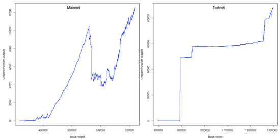 While parsing the blockchain we have counted all unspent P2WSH outputs for each block height, in both the mainnet and the testnet. The results of this can be found in Figure 12, as a graph showing unspent P2WSH outputs for different block heights. We can see a distinct difference between the two networks: the mainnet has a more organic growth as a result of real-world use, while the testnet graph is characterized by the testing which the network is used for. The sharp decline in unspent outputs on the mainnet at around block 505,000 can be explained by the sharp decline in fees for doing transactions at that time [25], which incentivized users to consolidate their unspent outputs into fewer bigger ones.