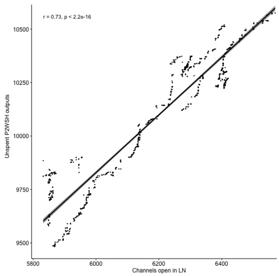Correlation between unspent P2WSH outputs and channels open in the LN mainnet.