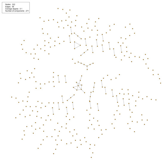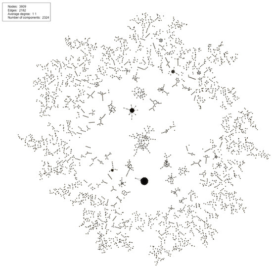 If we combine our results of using all three heuristics on the channel sets, in the mainnet we get a total of 4436 relationships between the channel graphs. This enabled us to create 2182 links between channels. The reason for this difference is redundancy of connections and key reuse within a single channel graph. This means that 2254 of our relationships, or about 50% where redundant, but only 36 of them being the actual reuse of the same key in the same channel graph. The set of linked channels can be seen visualized in Figure 15, were we have created a channel network as discussed in Section 4.3. The network consists of 2324 smaller components, with each node having an average degree of 1.1. While this graph does not distinguish users, we can reveal additional information about the users participating in the channels. As edges represent at least one common user being present in both nodes, we can create the property: for adjacent nodes, there can be at most three different users and a minimum of two users. This means if the distance between vertices is more than one, we can no longer be sure if there is common user participation, but we cannot rule it out either. More importantly, it has an impact on complete components—i.e., every node is connected to every other node. Because the property we defined must hold for every node in such a complete component, there are only two possibilities with regard to user participation: there can be at most three total users in the component, or that one user participates in all nodes, but with a different second user in each. We can see a few examples of such components in Figure 15, and some components with a similar structure but with additional nodes which are not part of the complete core of the component.
