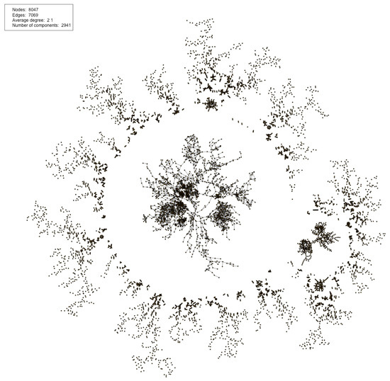 We did the same for the set of channel graphs from the testnet. The total number of relationships using all three heuristics was 12,955, while the number of links we could create was 7084. Again, 45% of the connections we found where redundant for actually linking the channels. Here the number of reused keys within a single channel graph was 113, which is relatively small compared to the 5758 other redundant relationships. The channel network is shown in Figure 16 is more connected than the mainnet in Figure 15, with the testnet network having over twice as many nodes, but only having 617 more components. We can see this difference clearly with the large component in the middle of the testnet graph. As the LN is one network, it should consist of one dynamic component, meaning a historic network graph should also ideally have one large component. While we can see this beginning to emerge in our testnet channel network, it is very clear in the channel network constructed using LN data as seen in Figure 17.