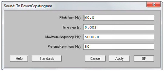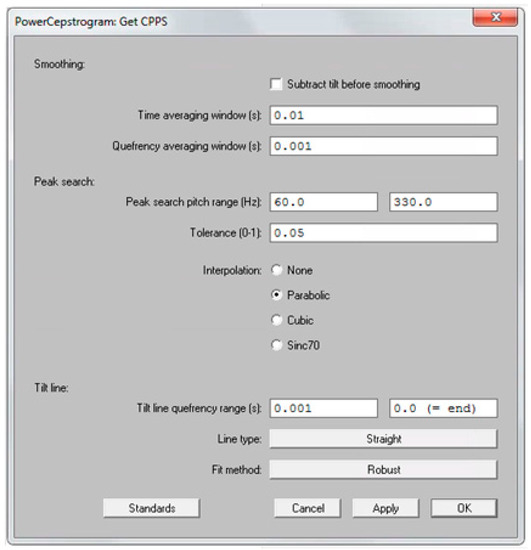 Because certain acoustic measures used in AVQI are only valid for voiced segments, the continuous speech samples needed to be edited. Detection and extraction of voiced segments from the first two sentences of the speech task were performed in the software Praat using the extraction Praat-script from Maryn et al. (2009) [5], an algorithm based on three criteria, proposed by Parsa and Jamieson (2001) [6]. A segment was considered to be voiced if (a) sound energy exceeded 30% of the overall sound energy, (b) zero crossing rate was less than 1500 Hz, and (c) the normalized autocorrelation peak was above 0.3. Subsequently, the medial three seconds of the vowel /a:/ were appended to the voiced segments, resulting in a concatenation sample with a correspondent single sound waveform. The six acoustic measures implemented in AVQI were obtained using the software Praat. First, harmonics-to-noise-ratio (i.e., HNR) was specified as the base-10-logarithm of the ratio between the periodic energy and the noise energy multiplied by 10. Secondly, shimmer local (i.e., SL) was the absolute mean difference between the amplitudes of successive periods divided by the average amplitude. Thirdly, the shimmer local dB (i.e., SLdB) was obtained as the base-10-logarithm of the differences between the amplitudes of successive periods multiplied by 20. Fourthly, the general spectral slope (i.e., Slope) was calculated as the difference between the energy in the 0–1 kHz range and the energy in the 1–10 kHz range of the long-term average spectrum. Fifthly, the spectral trendline inclination (i.e., Tilt) was measured as the difference between the energy in the 0–1 kHz range and the energy in the 1–10 kHz range of the trendline through the long-term average spectrum. Finally, the sixth and main acoustic measure implemented in AVQI, smoothed cepstral peak prominence (i.e., CPPS), was calculated as the distance between the first rahmonic’s peak and the point with equal quefrency on the regression line through the smoothed cepstrum. To determine the CPPS in the software Praat on a Windows or Mac computer, the following steps were completed: First, click on the “Analyze periodicity –” menu, choose “To PowerCepstrogram…”, and then complete the “Sound: To PowerCepstrogram” form as shown in Figure 1. Second, query the resulting PowerCepstrogram object by clicking on the “Query –” menu, choose the “Get CPPS…” option, and then finally complete the “PowerCepstrogram: Get CPPS” form as shown in Figure 2. The result of these steps is that the CPPS is shown as a value in dB in a “Praat Info” screen. Ultimately, AVQI (v.02.06) was calculated according to the following regression formula: