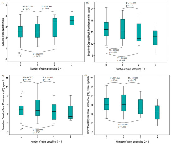 AVQI and CPPS data for the different subclinical levels of dysphonia are provided in Table 5. As more judges rated G as 1 (i.e., slight dysphonia), the higher mean AVQI values were observed. A significant difference was found between the true normophonic cohort and the second subclinical dysphonia cohort (Figure 3a, U = 392.00, p = 0.028). For CPPSvowel, a declining trend was observed with a significant difference between the true normophonic and the second subclinical dysphonia cohort (Figure 3b, U = 422.00, p = 0.048). For CPPSsentences and CPPScombination no consistent trend was observed (Figure 3c,d, respectively). Comparisons with the third subclinical cohort were not conducted since this cohort included only three subjects and the statistical power consequently would be too low.