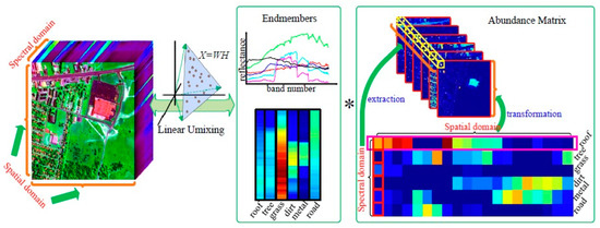 Due to the low spatial resolution and materials mixture in remote sensing, the spectrum of each pixel is always considered as the mixture of some spectral signatures of pure materials. The spectral signatures of pure materials are termed as endmembers, while the proportion of each endmember for mixing is termed as abundance. Thus, can be decomposed into endmembers with an abundance matrix as