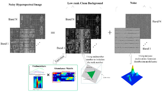 where is an endmember matrix, is an abundance matrix and is the number of endmembers. Figure 1 illustrates above representation. Based on the abovementioned issues, we first analyze why HSI denoising can be formulated as a LRMA problem. Then, we analyze how to use the provided prior knowledge LMM to initialize the rank number of LRMA.