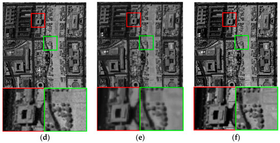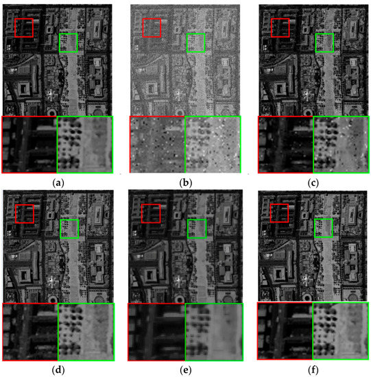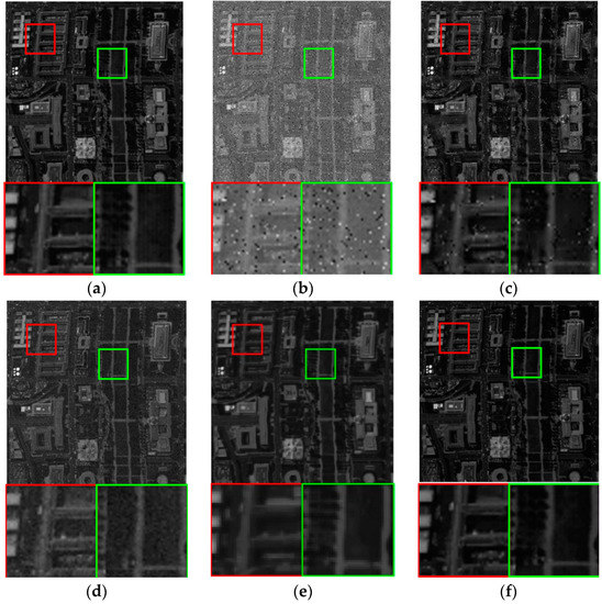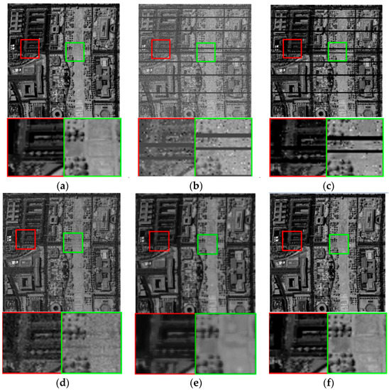 Figure 5 and Figure 6 illustrate the restoration results of incomplete bands 70 and 72, which is influenced by uniform noise, Gaussian noise, and dead pixels. The restoration results via VBM3D, Godec, SLrank, and low-rank method are given in (c)–(f). In these figures, two areas of interest are zoomed for a detailed comparison. From the visual results of different methods, it can be seen the results on those two noisy incomplete bands are similar to those in Figure 3 and Figure 4. Noise still obviously exists in the results of VBM3D method. Though Godec based method has comparable restoration results with the proposed low-rank method, some band (band 70) is oversmoothed. Since low-rank matrix analysis is capable of handling the missing data, it can be seen that Godec based, SLrank based, and the proposed low-rank methods simultaneously fill the missing values as well as remove the noise. On the contrary, the dead lines still exist for VBM3D based methods.
