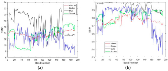 Table 1 and Figure 7 give the PSNR and SSIM values. Those values are calculated with all original clean image band and the noisy image band. Figure 7 illustrates the PSNR and SSIM values varied with different bands for different restoration methods, where the vertical axis denotes the PSNR/SSIM values and the horizontal axis denote the band number. In Figure 7, the curves colored with red, blue, green, and black represent the results of VBM3D, Godec, SLrank, and the proposed low-rank, respectively. It can be seen from Figure 7 that the proposed low-rank method has highest PSNR and SSIM value among all competing methods in most bands. The average PSNR and SSIM for all bands are given in Table 1, from which we can see the proposed method obtains better PSNR/SSIM compared with any other competing methods.
