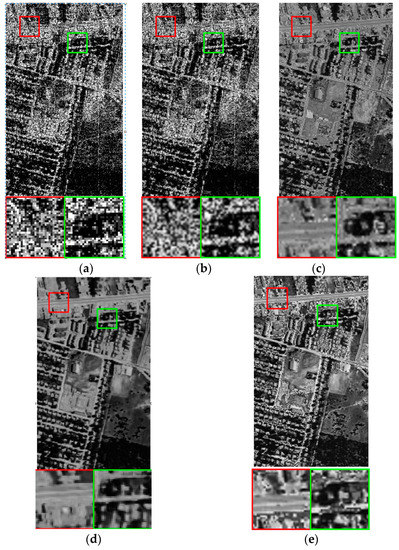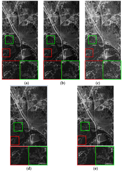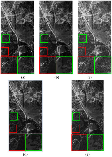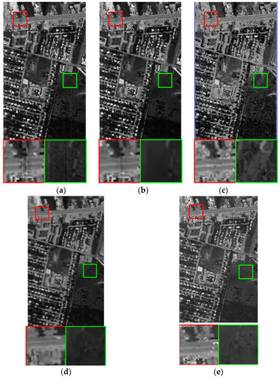 We restore terrain data on all bands with VBM3D, Godec, SLrank, and the proposed low-rank based method. Figure 8 and Figure 9 illustrate the experimental results on bands 1 and 4, where two areas of interest are zoomed. These bands are influenced by Gaussian noise, stripes and dead lines. The real image band is given in (a). The restoration results of VBM3D, Godec, SLrank, and the proposed method are illustrated in (b)–(e). It can be seen that the proposed low-rank method has better performance compared with other competing methods. The stripes and dead lines are well addressed and the details of HSI are well preserved. The dead lines and stripes still remains for VBM3D based method.