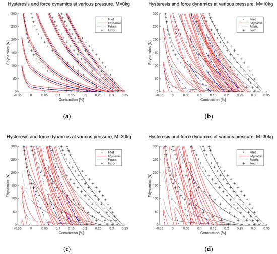 Figure 5 shows the force dynamic characteristics of the proposed empirical modeling at various static loads and input pressures. Experimental contacting force data () was obtained through actual testing of McKibben muscles using the vertical load system. While a static contracting force () illustrates the graphical solution from the empirical modeling. This static force remains unchanged, which indicates the actual force characteristic of the McKibben muscle with zero load implementation. Net contracting force () and dynamic contracting force () show the dynamic behavior of the vertical load system. Where the static contracting force was affected by the static load and frictional effects of the contacting surface in between rubber tube and braided mesh sleeve, thus yielding to the hysteresis phenomena during cyclic contraction and expansion.