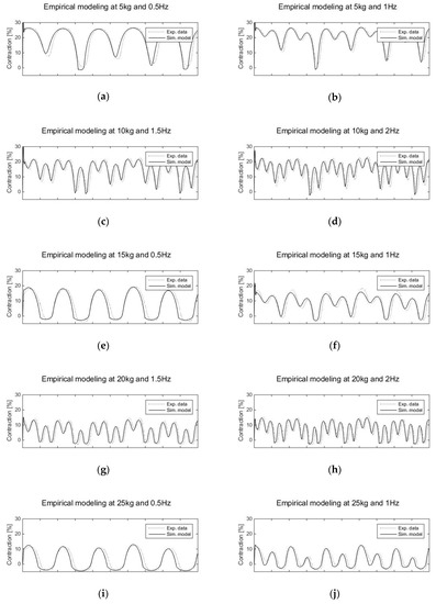 The random wave of input pressure was used to test the effect of the nonlocal memory or historic dependency on the proposed empirical model. This random input data consisted of various contraction patterns during cyclic contraction and expansion of the McKibben muscle. By employing random input data, the ability of the model to redefine its path towards required value can be clarified. In addition, the reliability and adaptability of the dynamic model of hysteresis also can be verified. The ability to convert the present path into the desired path is what defines the history dependency. The influence of the nonlocal memory causes the dynamic modeling of McKibben muscle complicated and difficult to be achieved. The proposed model testing while considering quasi-static, quasi-rate and historic dependencies were shown in Figure 8. These tests were accomplished by generating the random wave of input pressure with different excitation frequencies (0.5–2 Hz), and were then performed with various static loading (0–300 N). Based on the result, the proposed model was able to simulate the desired contracting length precisely with all sources of dependencies. The performance of the proposed empirical model was evaluated using a correlation test. Table 3 shows the correlation test of the proposed empirical model at all dependencies. The correlation test indicated the model performance with high mean correlation value and low standard deviation. The model was performed very well at lower frequencies with correlation values of (0.944 ± 0.009) at 0.5 Hz and (0.897 ± 0.007) at 1 Hz. For higher frequencies, the result was still significant with slightly decreasing correlation values of (0.843 ± 0.016) at 1.5 Hz and (0.752 ± 0.027) 2 Hz. Although the modification model and correction function were presented, there were some errors remaining due to the high nonlinearities of McKibben muscle that cannot be captured. These remaining errors could easily be eliminated with intelligent control strategies.