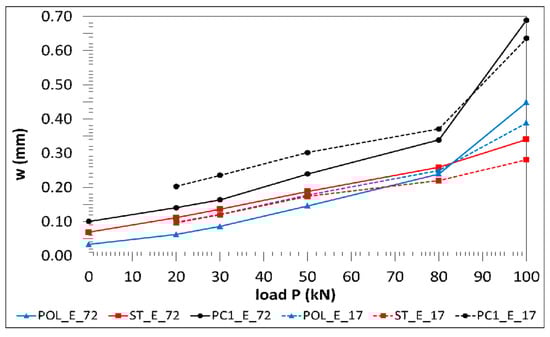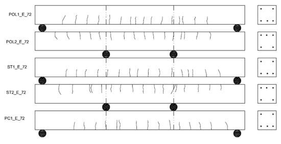 Even if experimental measurements were continuously recorded, five intermediate steps (20 kN; 30 kN; 50 kN; 80 kN; 100 kN) were taken as a reference for crack width, length and spacing. In the beams that did not reach the load of 100 kN (mainly the PC beams), namely the nominal ultimate load value predicted at the design stage, the last measurements were taken at a mid-span displacement of 20 mm (for the sake of comparison). At each of these five steps, the crack width and position as well as the complete development of the crack pattern were recorded. The crack widths were measured by using an electronic lens with a magnification factor of up to 200× (as during exposure), supported by an image processing software.