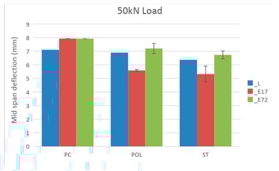 Mid-span deflection values under a service load of 50 kN at the end of the test (17 months for _E17 and 72 months for _E72 beams).