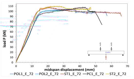 As experienced also for the beams tested in the first part of the program (Set #2), during the final loading stage the beams of Set #3 collapsed by concrete crushing after the yielding of the tensile bars (as expected from the design process). At failure, the PC beams showed the most extensive concrete damage, with concrete spalling at the upper compressive side. The flexural behavior of the reference beams tested under short-term conditions was very similar, showing a typical pseudo bi-linear curve. As also was found on the beams of Set #1 and #2, the influence of the fibers was almost negligible in terms of flexural strength, according to available literature [41,42,43,44]. As for Set #1 and #2, also in Set #3 a slight increment of yielding loads (4–8%) was registered in the FRC beams, due to the tensile contribution of fiber reinforcement.