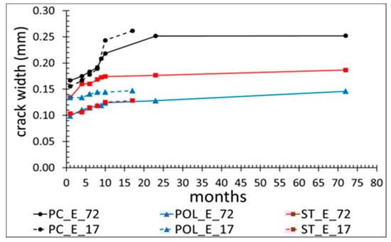 The cracking behavior of beams of Set #2 (exposed for 17 months) and of Set #3 (exposed for 72 months) is presented and discussed in this section. The discussion mainly concerns the crack width, since the crack distance was governed by stirrup distance. The measurements of the crack width during the sustained load of 50 kN (Set #2 and #3) showed that a smaller crack width was observed in the FRC beams (50–60% with respect to PC beam). Unfortunately, the last continuative measurement of crack width on the beams of Set #3 was taken after 23 months of exposure (due to the impossibility to gain access in the area at the time), when the average values of the crack width were equal to 0.26, 0.17 and 0.14 mm for PC, ST and POL beams, respectively.