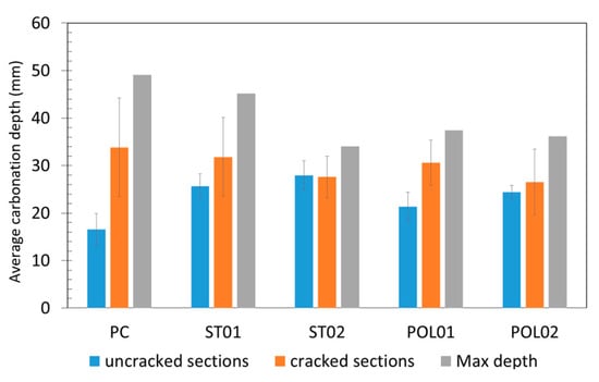 Figure 7 shows that, in cracked sections, the PC beams had the higher value of the maximum carbonation depth (49.1 mm) as compared to the FRC beams (45.1/34 mm for ST1/ST2 and 37.4/36.2 for POL1/POL2); therefore, the beneficial effect of short fibers in the concrete mix is confirmed [23].