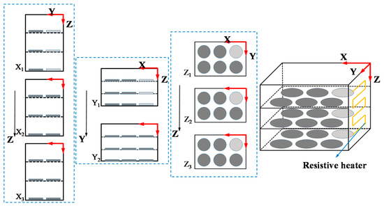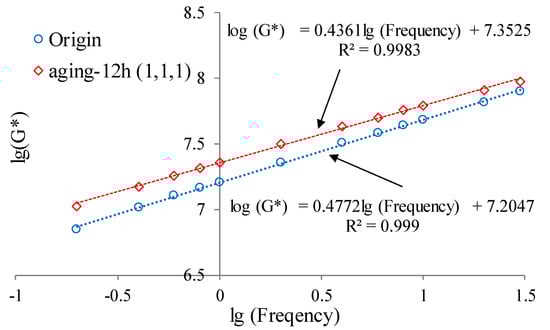 The asphalt mastics with certain weight were oxidized in a medium oven at 135 °C. The high temperature was created by a resistive heater at the right side of the oven. Because of the limitation of the recirculation within the oven, it is assumed that the temperature or air condition at different positions in the oven may vary, so mastics aged from different positions in the oven were compared by the TTS test. It could be seen from Figure 2 that there were 3 layers of mastic plates in Z-axis, 2 layers in Y-axis and 3 layers in X-axis. Testing results of the complex modulus G* at different loading frequencies at a temperature of 5 °C are exhibited in a log-log coordinate system, as Figure 3 shows. A linear regression model could be used to fit the relation between log (G*) and log (frequency), and it could be found that the aged mastics had higher G* than the original mastics at different loading frequencies.