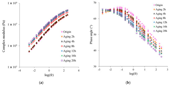 There are two ways to fabricate the aged mastics. One is by aging the binder firstly, and then adding certain weight of fillers into the aged binder; the other way is to first add the fillers into the virgin binder, then aging the mastics to certain times. Figure 5 shows the different results of the master-curves obtained from two different aging processes after 8 h. From Figure 5a, it could be found that, compared with the original binder, when the mastics are aged with fillers inside, the complex modulus changes more than mastics aged without fillers inside. As can be seen in Figure 5b, mastics aged with fillers have a lower phase angle than aged without fillers. Therefore, it could be concluded that the fillers could accelerate the aging level of the mastics and aging mastics with fillers is a better way to produce the aged mastics, since it considers the influence of fillers.