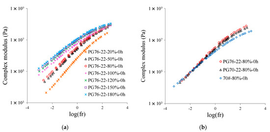 Master-curve of the complex modulus of mastics with different compositions before aging: (a) different filler contents; (b) different binders.