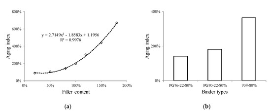 As can be seen in Figure 8, both filler content and binder types could affect the aging index dramatically. In Figure 8a, the aging index increased with the increasing filler content in a quadratic function, and the R2 could reach 0.99. Since the oxidation of mastics is a diffusion mechanism [25,26], the effect of filler content on the aging index may come from the different binder film distributions caused by different volume of fillers inside the binder. Additionally, as shown in Figure 8b, the aging index of the mastic with unmodified binder was larger than mastics with SBS modified binder, so the modification of the binder can also influence the aging properties of mastics.