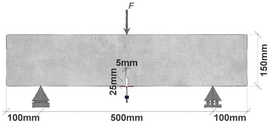 A total of four beams were cast per concrete batch. The beam dimensions were 700 mm × 150 mm × 150 mm (Figure 2), with a span length of 500 mm. A notch (25 mm depth and 5 mm width) was cut in the middle of the beam to control the crack initiation and propagation along the initially induced notch. The test was conducted under three-point bending loading conditions, with the load applied at a constant CMOD rate of 0.05 mm/min up to CMOD = 0.1 mm, followed by a constant CMOD rate of 0.2 mm/min. The load (kN) and CMOD (mm) were recorded for the analysis of residual flexural strength at various CMODs. CMOD1 to CMOD4 correspond to CMODs of 0.5 mm, 1.5 mm, 2.5 mm, and 3.5 mm respectively. The loads corresponding to each CMOD were recorded as .