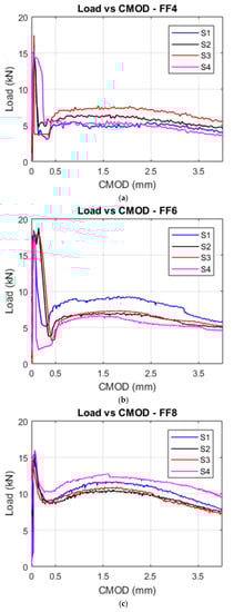 Load vs. crack-mouth opening displacement (CMOD) for (a) FF4, (b) FF6 and (c) FF8.