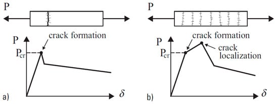 The fib Model Code 2010 [34] presents the most comprehensive design guidelines for fiber-reinforced concrete, focusing both on material behavior and structural behavior. The basic principles introduced are mainly obtained from research of steel fiber reinforced concrete (SFRC), but the fib model is adaptable to other types of fibers [37]. SFRC exhibits strain-softening behavior, as shown in Figure 6. Simplified load-deformation curves; (a) strain softening, and (b) strain hardening [37]. However, this strain softening-behavior can be different for FRC incorporating synthetic fibers.