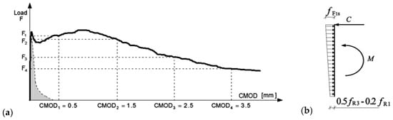 (a) Typical load vs. CMOD curve for plain concrete (in grey) and fiber-reinforced concrete (FRC) (in black) and (b) Stress distributions assumed for FRC in the fib Model [37].