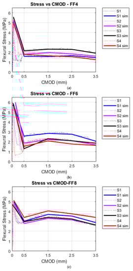 Flexural stress vs. CMOD plots for (a) FF4, (b) FF6 and (c) FF8, along with the corresponding line connecting maximum stress to stress at CMOD1, CMOD2, CMOD3, and CMOD4.