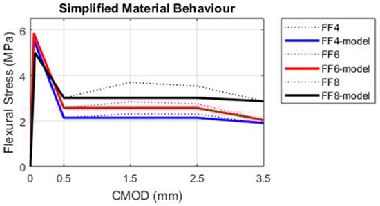 In order to predict the moment capacity of a FRC element under bending, the material behavior, particularly the stress–strain behavior of FRC, should be defined first. The loads in Figure 4 can be converted to flexural and residual flexural strengths, using Equations (1) and (2). Figure 8 displays the stress vs. CMOD curves (dashed lines) along with simplified curves connecting maximum stress, stress corresponding to CMOD1, CMOD2, CMOD3, and CMOD4 (solid lines). It can be noted here that the CMOD1 corresponds to the serviceability limit state, whereas the CMOD3 usually corresponds to the ultimate limit state [37]. Since the stress remained almost constant between CMOD1 to CMOD3, it can be assumed that , and a simplified model can be proposed, as shown in Figure 9. In addition, it can be seen that the drop in magnitude from to is less as the fiber dosage increases from 4 kg/m3 to 8 kg/m3. The ratio of the four samples of the three different mixtures are tabulated in Table 8. ratio of all tested samples for three different mixtures, the average and standard deviation of each mixture are also presented. The ratio is within an acceptable standard deviation for FF4 and FF8, while FF6 exhibited a significant variation. Even though the variation for FF6 is high, it can be assumed as a general trend that the ratio increases with the increase in fiber dosage.