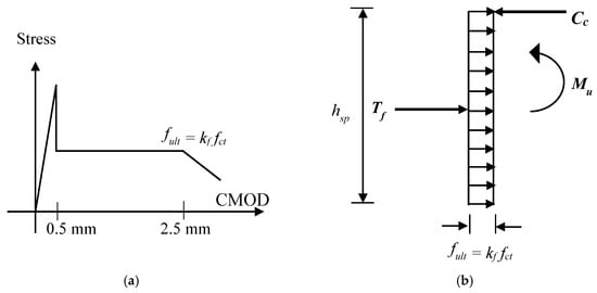 At failure, as seen in Figure 5, the crack reached the top surface of the concrete beam where the crack width is considered to reach the serviceability limit (0.5 mm), while the crack width at the bottom is considered to reach the ultimate limit (2.5 mm). Figure 9 shows that the stress is constant between the CMOD of 0.5 to 2.5 mm. As plastic deformation is observed between 0.5–2.5 mm CMOD (Figure 9 and Figure 10a), the whole critical cross-section of the beam is subjected to the tensile post-cracking residual stress (Figure 10b). Again, as the crack reached the top surface of the beam, it can be assumed that the compressive stress is concentrated at the top fiber. Hence, the ultimate moment capacity can be determined using Equation (6).