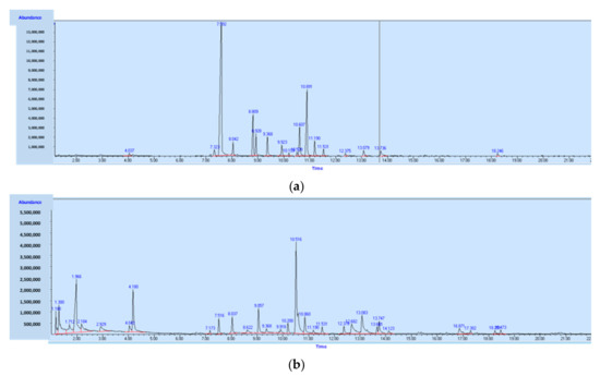 Chromatograms resulting from solid-phase microextraction (SPME)–GC–MS analysis of the crushed seeds headspace using two different fiber coatings: (a) carboxen/polydimethylsiloxane (PDMS) (75 μm) and (b) PDMS/divinylbenzene (DVB) (65 µm) (T, 23 °C; tadsorption, 30 min).