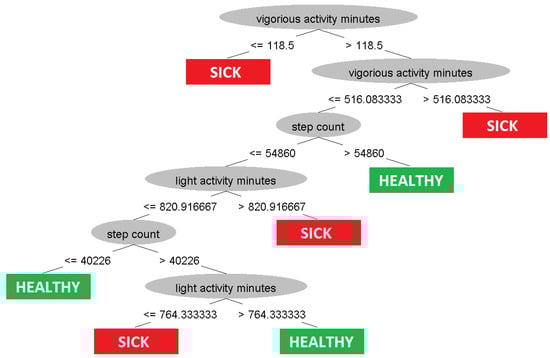 As the final result of the study, it was concluded that if the number of steps is lower than around 61,000 a week, it is likely that the child is suffering from type 1 diabetes. After dividing this by the seven days of a week, we obtained the average number of steps per day, which was around 9000, but it should be noted that gender and age were not included in the calculation of this result. The updated international literature indicates that we can expect, among children, boys to average 12,000–16,000 steps/day, girls to average 10,000–13,000 steps per day, and adolescents to reach approximately 8000–9000 steps/day []. Thus, the obtained result was consistent with the normative international literature.
