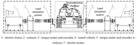 Tracked vehicles are widely used in agriculture, weapons, and engineering construction because of their superior performance under complex conditions. The load simulation technology of a tracked vehicle is rapidly evolving because it can provide a convenient, effective, and lifelike test environment [1,2,3]. By modifying different parameters on the test bench, the power output, emission performance, and braking performance of the vehicle under different temperature, humidity, and ground conditions can be tested. Additionally, only when the body inertia and ground load simulated by the loading system are consistent with the real situation can the load simulation research test be meaningful [4,5,6,7]. At present, in order to overcome the problem that the traditional mechanical simulation method has a narrow simulation range and cannot achieve stepless simulation, most researchers use the method of an electric motor to simulate mechanical inertia (hereinafter referred to as electrical inertia) [8,9].