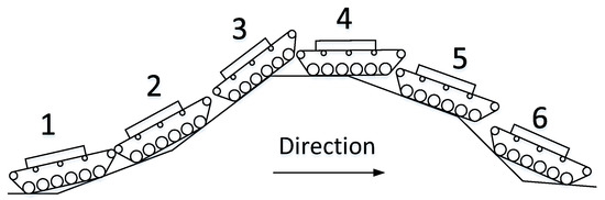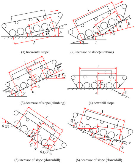 Because tracked vehicles often travel on complex roads, it is necessary to study their driving conditions when switching between different slopes in body dynamics modeling. In this paper, the driving conditions of tracked vehicles are divided into six processes, namely, the horizontal slope, increase of slope, downhill slope, decrease of slope, increase of slope, and decrease of slope, respectively, corresponding to stages 1 to 6 in Figure 2.