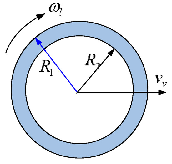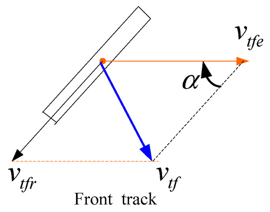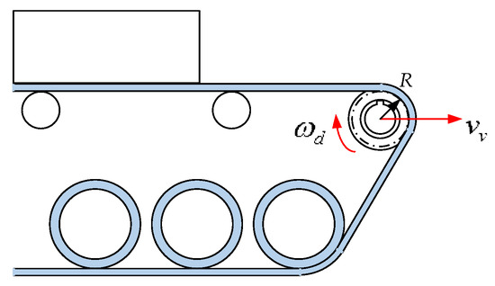 The biggest difference between a tracked vehicle and traditional vehicle is that a tracked vehicle is equipped with high-quality tracks [32]. Because the track is irregular and the absolute speed of each part when driving is different, it should be divided into four parts, including the upper, lower, front, and rear parts, when calculating. Assuming that the tracked vehicle is moving at a uniform speed on the ground with no relative slip, that is, the slip rate , the inertia of the grounding part of the track can be ignored. However, in a normal driving process, due to bad ground conditions (such as marsh, snow, etc.), the slip rate is usually not stable, so it is necessary to consider the total inertia of the track. To analyze it, the speed of each part is decomposed into relative speed and frame speed, which is shown in Figure 6.