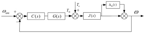 As can be seen from the above figure, the control method is actually used to track the speed response of the system under the current torque. However, in the actual operation process, because the system is affected by environmental factors and friction coefficients at different velocities, a non-linear uncertainty exists in its transfer function. In addition, the system loop is also affected by the driving torque , which is an external additional torque for the whole load simulation system. [34,35]. However, in practice, the system is driven by the combined torque of and . For the control loop, is not controlled by the system and is controlled by the external controller on the test vehicle or throttle. Therefore, for the load simulation system, is an uncontrollable random variable, and when it changes dramatically, it is very likely that the system will deviate from the target speed. Because of this, when changes or mutations occur, the stability of the system is problematic. In this regard, it is necessary to design a controller C which can not only adjust the loading and transmission system, but also respond quickly and follow under the action of system disturbance torque.